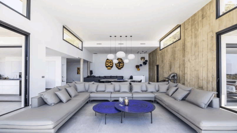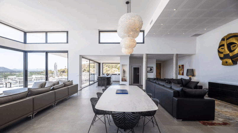 L’entrée se fait par une majestueuse porte pivotante, dévoilant un séjour de 90 m² baigné de lumière naturelle grâce à ses baies vitrées panoramiques. Vous profiterez d’un espace salon TV, d’une salle à manger élégante avec table 3,2 × 1,4 m, et d’un séjour panoramique ouvert sur la piscine et les paysages environnants.