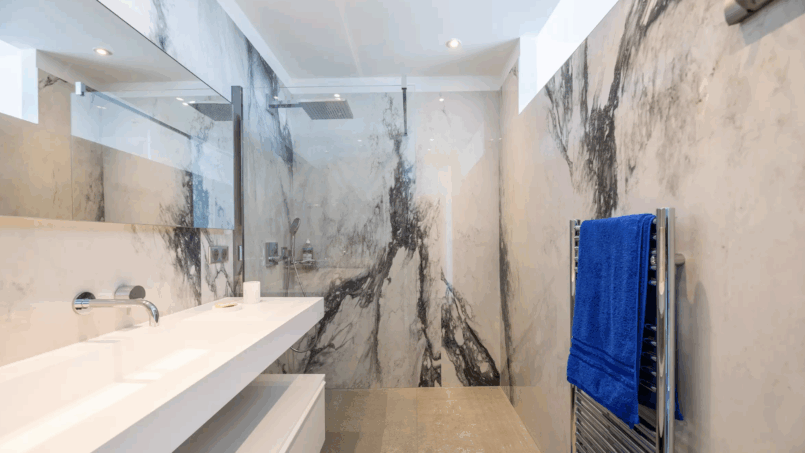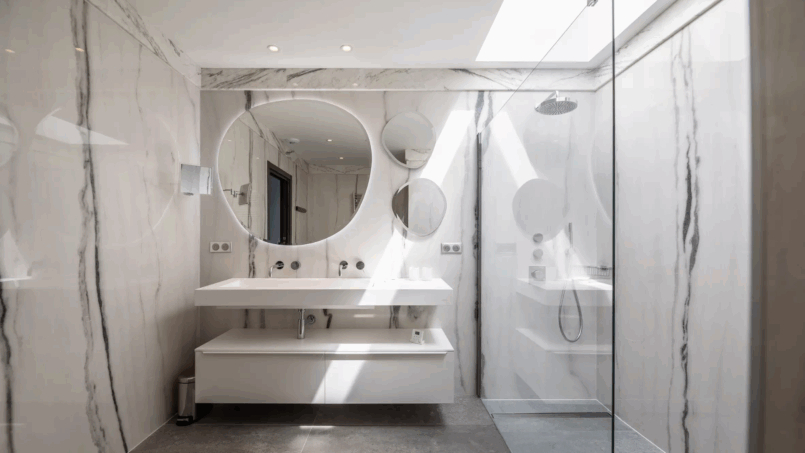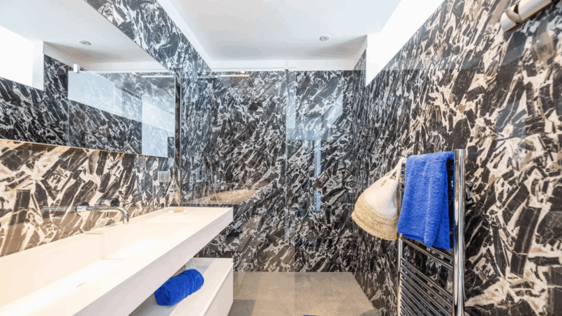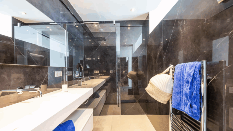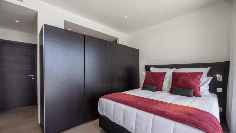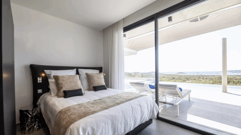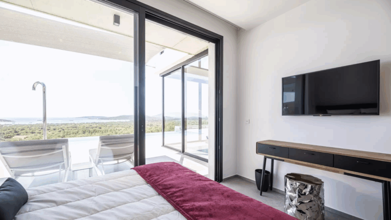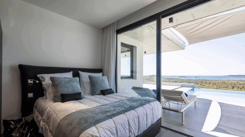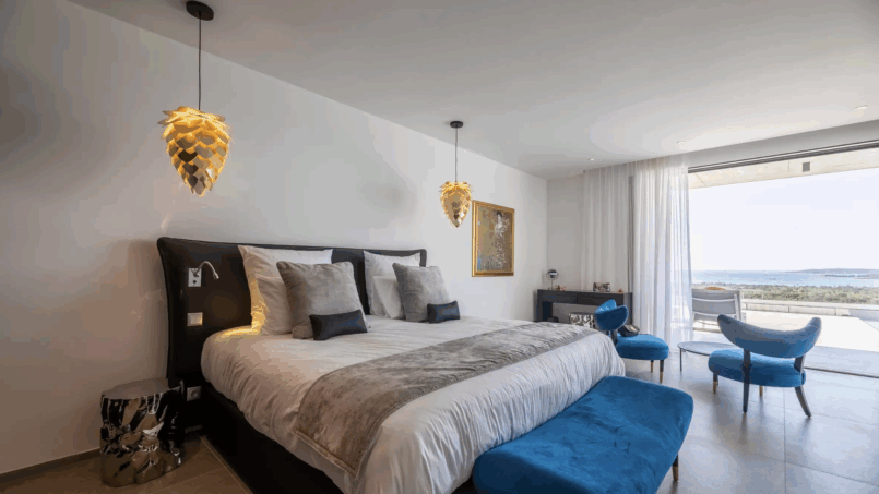 3 chambres de 18 m² avec baies vitrées avec volets roulants et moustiquaires donnant directement sur la terrasse. Vue imprenable sur la mer, piscine et montagne, chacune offrant une atmosphère élégante et chaleureuse, pensée pour le confort optimal. Lit queen-size 160×200 cm aux normes hôtelières 5*. Salle de douche privative avec douche italienne, sèche-serviettes, sèche-cheveux et miroir en pied.