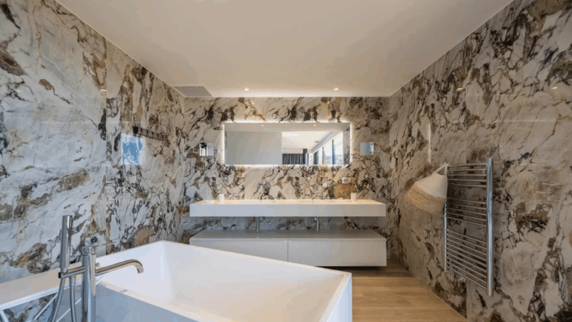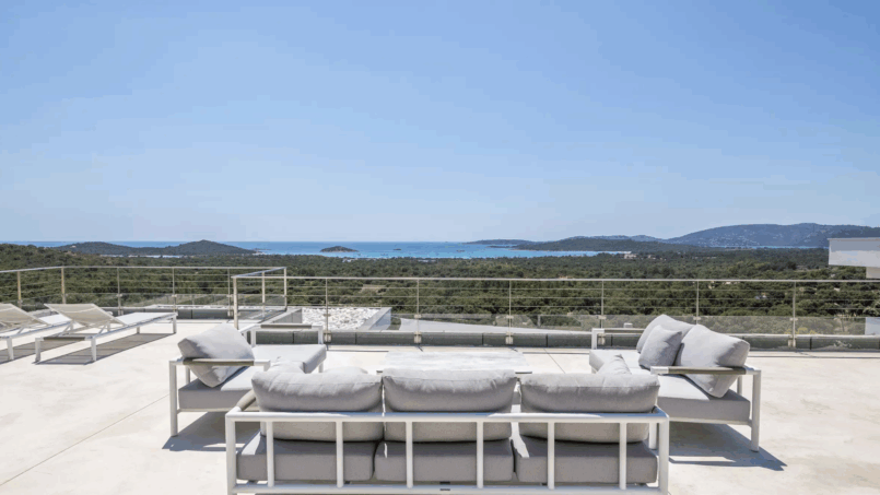 Répartie sur deux niveaux, la villa dispose également d’une terrasse sur toit de 160 m² et d’une terrasse principale de 190 m², offrant de vastes espaces pour profiter pleinement du cadre.