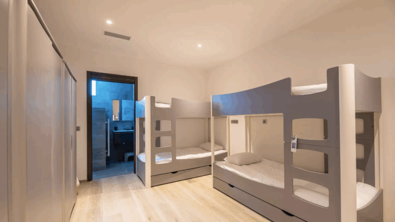 Un hublot vue piscine est présent dans la salle de fitness et au niveau du dortoir des enfants.