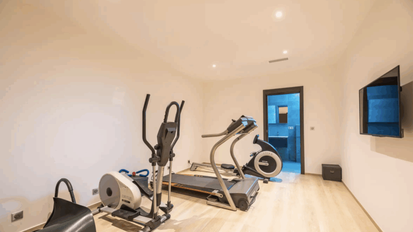 Salle de fitness équipée (tapis de course, vélo elliptique, rameur, haltères).