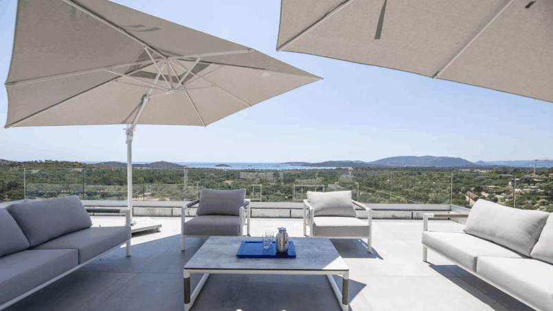 Sur un terrain de 2 070 m² exposé plein sud, la villa offre de vastes terrasses (190 m²) et un toit-terrasse de 160 m² pour profiter pleinement du soleil ou de l’ombre.