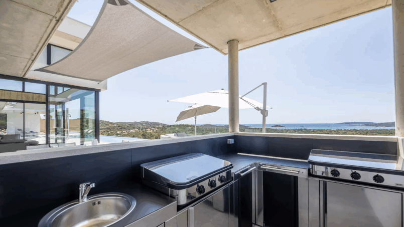 Une cuisine d’été équipée de deux planchas invite à des moments conviviaux face à la Méditerranée. Dix bains de soleil avec matelas, divans et fauteuils confortables vous permettront de savourer pleinement chaque instant.